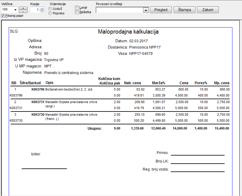 Ukoliko želite odštampati ulazne kalkulacije najbolje je to raditi na kraju dana zajedno sa štampanjem ostalih dokumenata. Sam proces štampanja je jednostavan i aktivira se tako što se u listi kalkulacija duplo klikne na bilo koje polje sem Id i Broj, željene kalkulacije koju želimo da odštampamo. Na ovaj način aktivirate pregled pred štampu za izabrani dokument. Pregled pred štampu takođe je moguće aktivirati klikom na ikonicu Pregled u toolbaru.