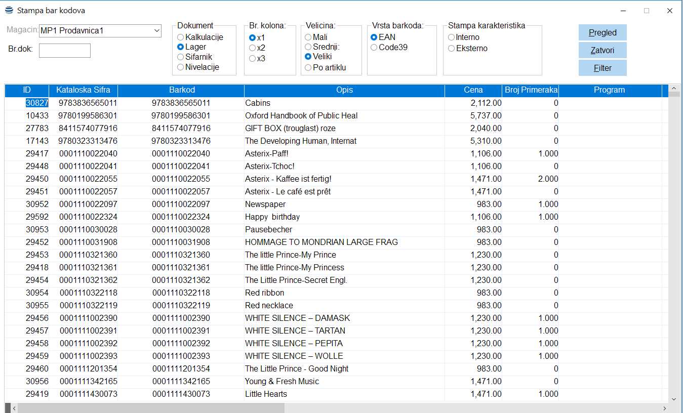 Ova opcija služi za štampanje barkodova preko specijalizovanih štampača koji koriste poseban protokol za štampu. Da biste aktivirali štampanje stikera u maloprodaji, potrebno je da pokrenete stavku menija Maloprodaja Pregledi Ostalo Štampa barkodova. Izabrati magacin. Bira se magacin u koji stiže roba. Ako se barkodovi štampaju po ulazima onda odabrati vrsta dokumenta kalkulacije a ako se doštampaju izabira se vrsta lager. Br. Kolona označava koliko ima nalepnica u jednom redu na traci. Uobičajeno da bude jedna ili dve nalepnice u redu. Veličina stikera se bira u odnosu kakva je veličina nalepnice koje je stavljena u štampač. U polja kalkulacija se unosi broj kalkulacije po kojima štampaju barkodovi. Ako se štampaju po lageru u ovo polje se ne unosi podatak. Nakon unetih podataka pritisnite dugme Pregled. U polju sa podacima će vam se pojaviti artikli po izabranom kriterijum. Pre nego li pošaljemo artikle na štampu moramo prvo da odaberemo za koje artikle treba odštampati barkodove. To su artikli za koje ste ustanovili preko data collectora da imaju neispravan barkod. Označavanje se vrši tako što držite pritisnuto dugme CTRL i kliknete na odabranu red. Kada izaberete sve artikle pritisnite dugme FILTER. Nakon toga ostaju samo izabrani artikli. Proverite još jednom filtrirane artikle i broj komada koji treba da se odštampa za svaki artikal. Vrsta barkoda označava koju vrstu barkodova će se štampati EAN 13 se bira za standardno obeležavanje artikala za koje ili štampamo interni barkod ili je barkod na ambalaži nije čitljiv pa je neophodno prelepiti nalepnicu. Štampa karakteristika biram opciju da li će se karakteristike štampati sa same kartice artikle iz polja karakteristike ili iz tabele za linijsko predstavljanje karakteristike (Extended text Line). Da biste odštampali barkodova pritisnite opciju štampe u alatkama kao kod štampanja dokumenata bez korišćenja opcije pregled pred štampom.