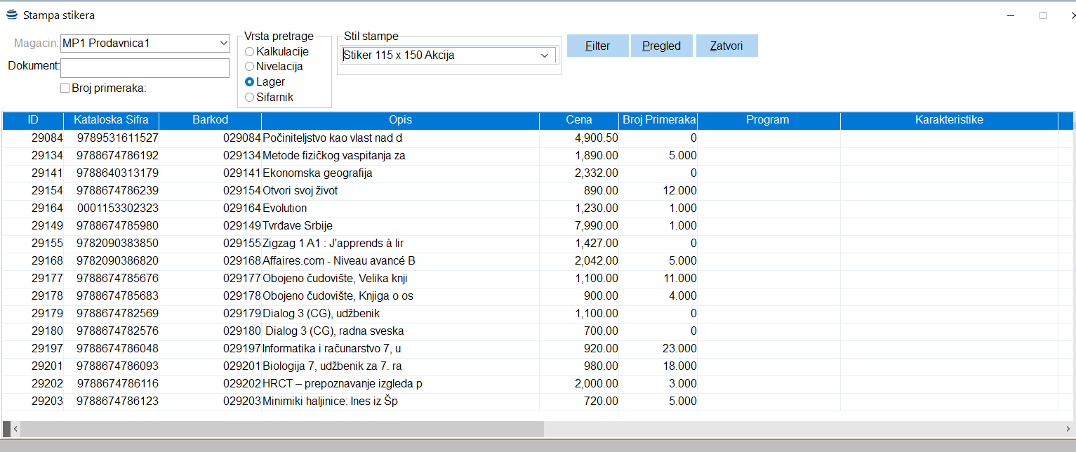Da biste aktivirali štampanje stikera u maloprodaji, potrebno je da pokrenete stavku menija Maloprodaja -Pregledi - Ostalo - Štampa stikera.