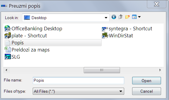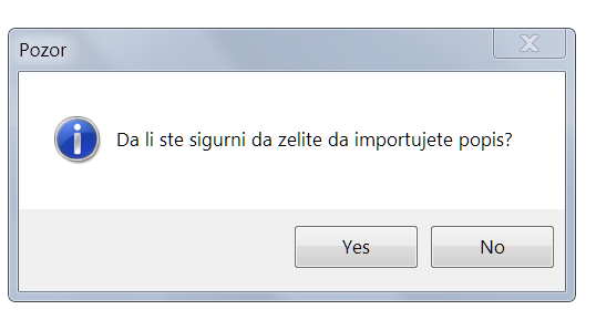 Odabira se opcija Yes i nakon toga se iz dijaloga za odabir fajlova odabere fajl iz koga se želi import popisa