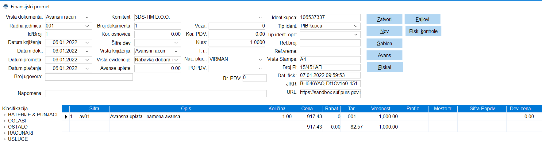Primer izdavanja avansnog računa sa uplatom od prethodnog dana gde primećujemo da je datum fiskalizacije različiti od datuma primanja uplate. Prilikom štampe računa u ovom slučaju u polju ESIR datum će se prikazati datum uplate avansa kao što je propisano od strane poreske uprave.