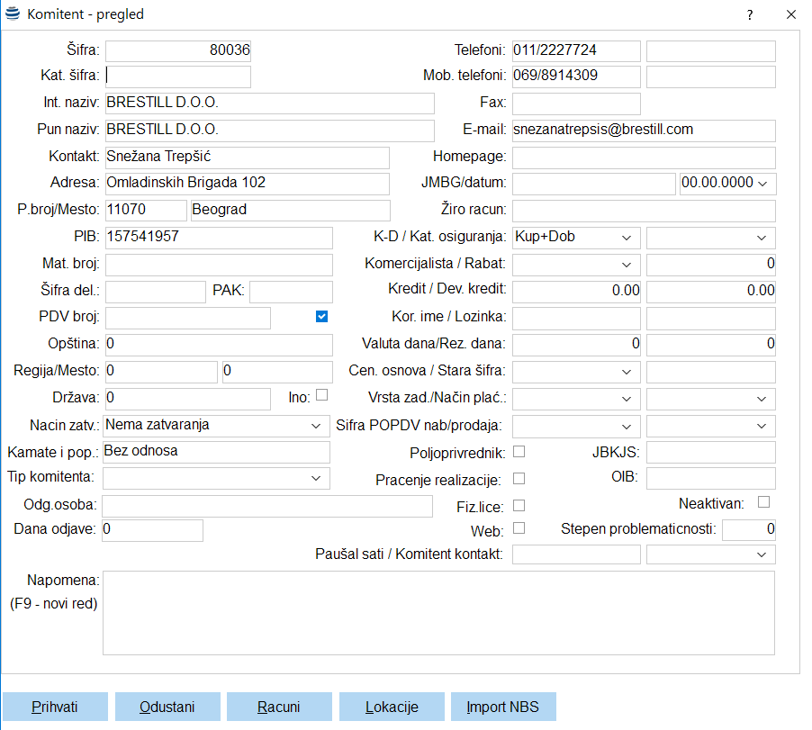 Napomena: Popunjavanje ostalih polja nije obavezno za potrebe maloprodaje i zavisi pod potrebe korisnika za praćenje određenih parametara kod klijenata ukoliko su aktivirani ostali moduli programa.