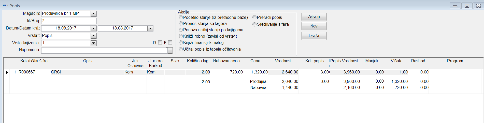 Manjak/Višak – Automatski se popunjavaju nakon popunjavanja polja kol. Popis i zavisno od toga da li na osnovu tog podatka imamo višak ili manjak izbranog artikla, popuniće se odgovarajuća kolona. U našem primeru pošto imamo višak od 1 komada popunila se kolona višak sa vrednošću 1.